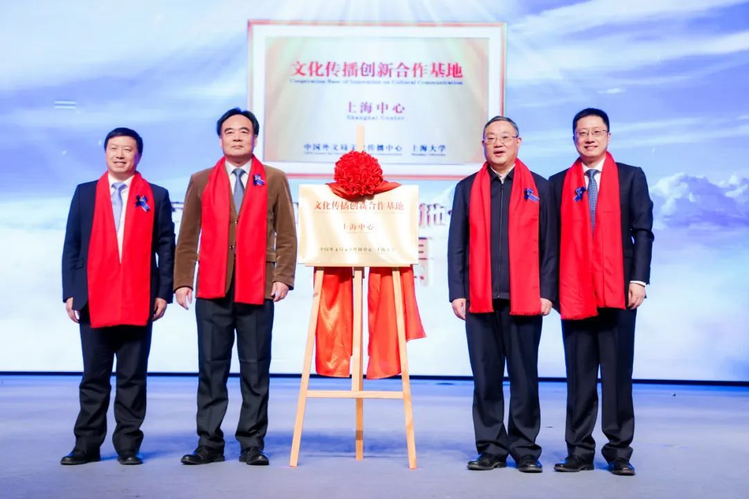 刘昌胜校长与张金庭主任签署共建协议,陆彩荣副局长、成旦红书记见证,并共同为“文化传播创新合作基地·上海中心”揭牌。基地的建立旨在深入贯彻落实习近平总书记关于文化建设和国际传播工作的一系列重要论述精神,更好履行外文局“提升中华文化国际影响力”核心使命,推动中华文化海外传播。