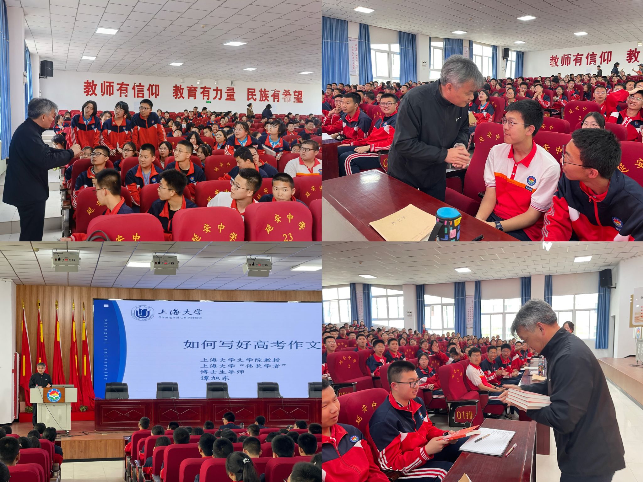 15日下午,招宣组一行来到了陕西省延安中学,与招生办公室主任郝晓龙开展座谈交流,就十大买球的正规网站在陕招生情况、专业设置、考研就业等信息进行了交流。随后,招宣组一行参观了延安中学校史馆,深入了解了该校的历史沿革、办学特色、文化建设及教学成果。最后,谭旭东教授面向全体高一学生以及语文教研组老师开展了《如何写好高考作文》的讲座,讲座紧扣高考作文的难点与重点,现场座无虚席、气氛热烈、掌声不断。