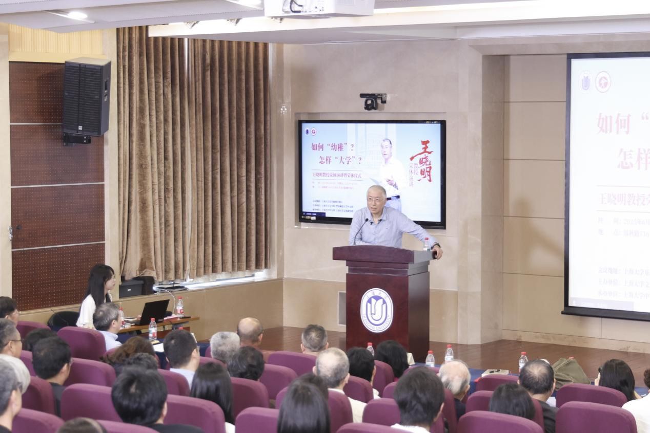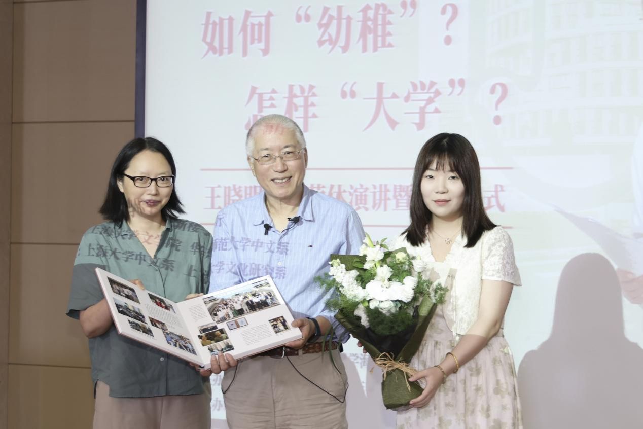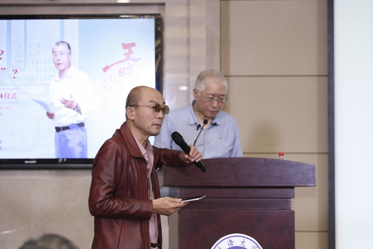 活动第二个环节主要是王晓明教授的荣休演讲。王晓明教授在《“如何‘幼稚’,怎样‘大学’”》主要讲了两部分内容:一方面回忆过往,以别人对他的“幼稚”评价入手回顾了自己的学术成长;另一方面是立足当下,剖析“大学”的挑战和应对。