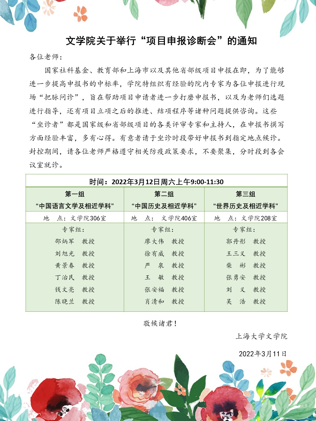 “项目申报诊断会”按学科相近原则划分为三组,3月12日于306会议室、406会议室、208会议室分场地进行。 “中国语言文学及相近学科” 专家组成员6位教授分别为邵炳军、刘旭光、黄景春、丁治民、钱文亮、陈晓兰;“中国历史及相近学科” 专家组成员6位教授分别为廖大伟、徐有威、严泉、王敏、张安福、肖清和;“世界历史及相近学科”专家组成员6位教授分别为郭丹彤、王三义、柴彬、张勇安、刘义、吴浩,申报教师分时段到各会议室“就诊”。