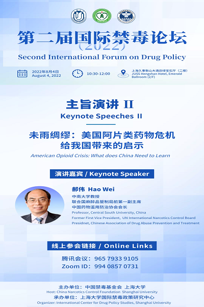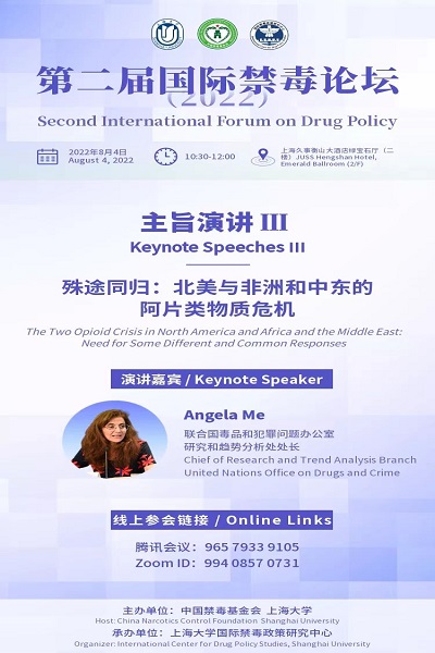 8月4-5日,中国禁毒基金会与十大买球的正规网站主办,十大买球的正规网站国际禁毒政策研究中心承办的“第二届国际禁毒论坛”以线上、线下相结合的方式在上海隆重举行。中国国家禁毒委常务副秘书长、公安部禁毒局局长梁云,上海市人民政府副市长、禁毒委员会副主任舒庆,联合国国际麻醉品管制局主席贾格吉特·帕瓦蒂娅(Jagjit Pavadia),上海市禁毒委员会副主任李余涛,中国国家禁毒办副主任、中国禁毒基金会秘书长李宪辉,中国国家禁毒办副主任于海斌,中国禁毒基金会副理事长古润金,上海市禁毒委员会办公室主任王石平,十大买球的正规网站党委书记成旦红,十大买球的正规网站党委副书记段勇等领导和嘉宾出席了开幕式。开幕式由上海市禁毒委员会办公室主任王石平主持。
