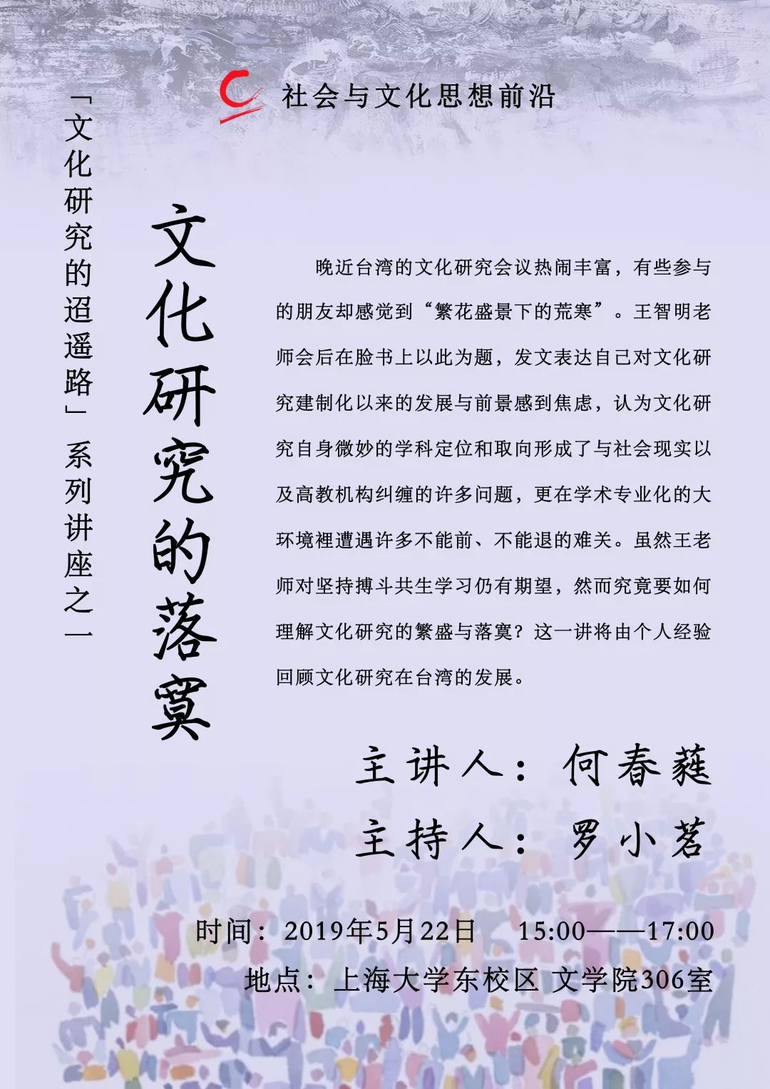 每个学科都有它的生命史,铭刻了一个学科和它的参与成员在历史里的存在与作为。1987年台湾解严后,围聚在所谓「文化研究」领域里的批判知识份子,曾经积极地探究挑战社会文化现况并生产各种层次的理论分析和论述,也热烈地加入在地的各种社会运动并提供论述和策略并肩作战,个别研究者同时尝试在各自的学术专业领域里灵活的撑出文化研究跨领域进路的空间。不过,文化研究在正式体制化的道路上面对了新自由主义数量化业绩挂帅的学术生态,未来前景如何展望?这条迢遥路标记了怎样的历史际会?还能以什么样的形式参与社会震荡?本次演讲系列将以个人在这个历史过程中的具体经验来讲述一个学科的生命回路。