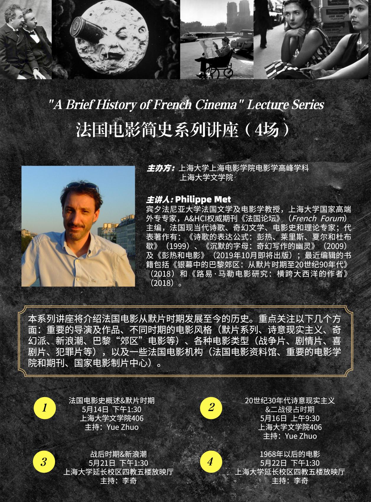 本系列讲座将介绍法国电影从默片时期发展至今的历史。重点关注以下几个方面:重要的导演及作品、不同时期的电影风格(默片系列、诗意现实主义、奇幻派、新浪潮、巴黎“郊区”电影等),各种电影类型(战争片、剧情片、喜剧片、犯罪片等),以及一些法国电影机构(法国电影资料馆、重要的电影学院和期刊、国家电影制片中心)。