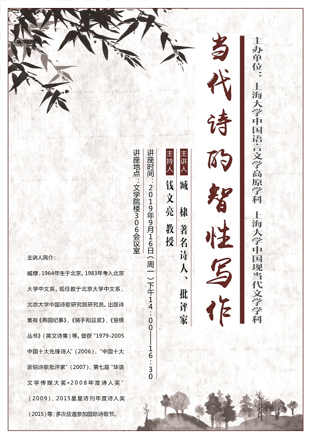 臧棣, 1964年生于北京。1983年考入北京大学中文系。现任教于北京大学中文系,北京大学中国诗歌研究院研究员。出版诗集有《燕园纪事》、《骑手和豆浆》、《慧根丛书》(英文诗集)等。曾获 “1979-2005中国十大先锋诗人”(2006)、“中国十大新锐诗歌批评家”(2007)、第七届“华语文学传媒大奖•2008年度诗人奖”(2009)、2015星星诗刊年度诗人奖(2015)等;多次应邀参加国际诗歌节。
