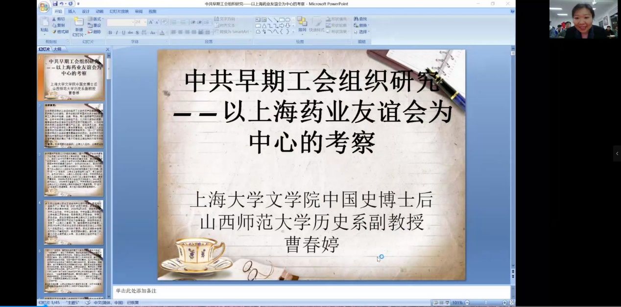 接着,曹春婷副教授做了题为《中共早期工会组织研究——以上海药业友谊会为中心的考察》的报告。曹老师以中共早期领导的工会组织为切入点,深入浅出地讲述了上海早期工会从相对沉寂到如火如荼(1921-1926年),再从轰轰烈烈到折戟沉沙(1926.10-1927.4)的曲折的发展过程。