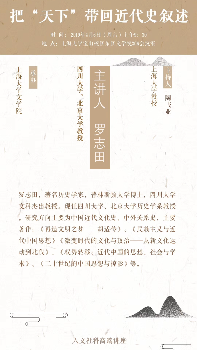 4月6日,四川大学、北京大学罗志田教授应邀来十大买球的正规网站,举行题为“把‘天下’带回近代史叙述”的学术讲座。本讲座由上海研究院主办、十大买球的正规网站历史系承办,陶飞亚教授主持。十大买球官网张勇安、宁镇疆、徐有威、王栋、杨卫华、舒健等教师、机自学院教授、校内外硕博士研究生、本科生及华东师范大学近80人参加了此次讲座。