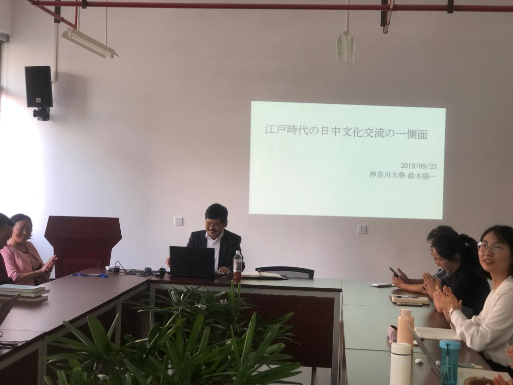 9月23日下午,日本神奈川大学外国语学部教授铃木阳一先生在十大买球的正规网站406室做了一场题为“江户市民喜欢的〈唐物KARAMONO〉------从‘桌袱料理(Shippoku)到流行歌‘九连环’(Kankannou)’”的学术讲座。讲座由中文系杨绪容教授主持。中文系饶龙隼教授、姚蓉教授、曹辛华教授、李德强老师及多名硕博研究生、博士后参加了讲座。