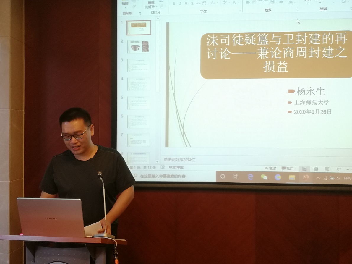 第四位是上海师范大学杨永生老师,他宣读《沫司徒疑簋与卫封建的再讨论——兼说西周诸侯身份的“君”、“臣”两重性》一文,认为沫司徒疑簋上“来伐”指王去征伐武庚,非征伐武庚归来;沫司徒疑为周王臣属。揭示了康叔由“王之斥侯”到一国之君封建过程,也反映了西周分封下诸侯身份的“君”、“臣”两重性。