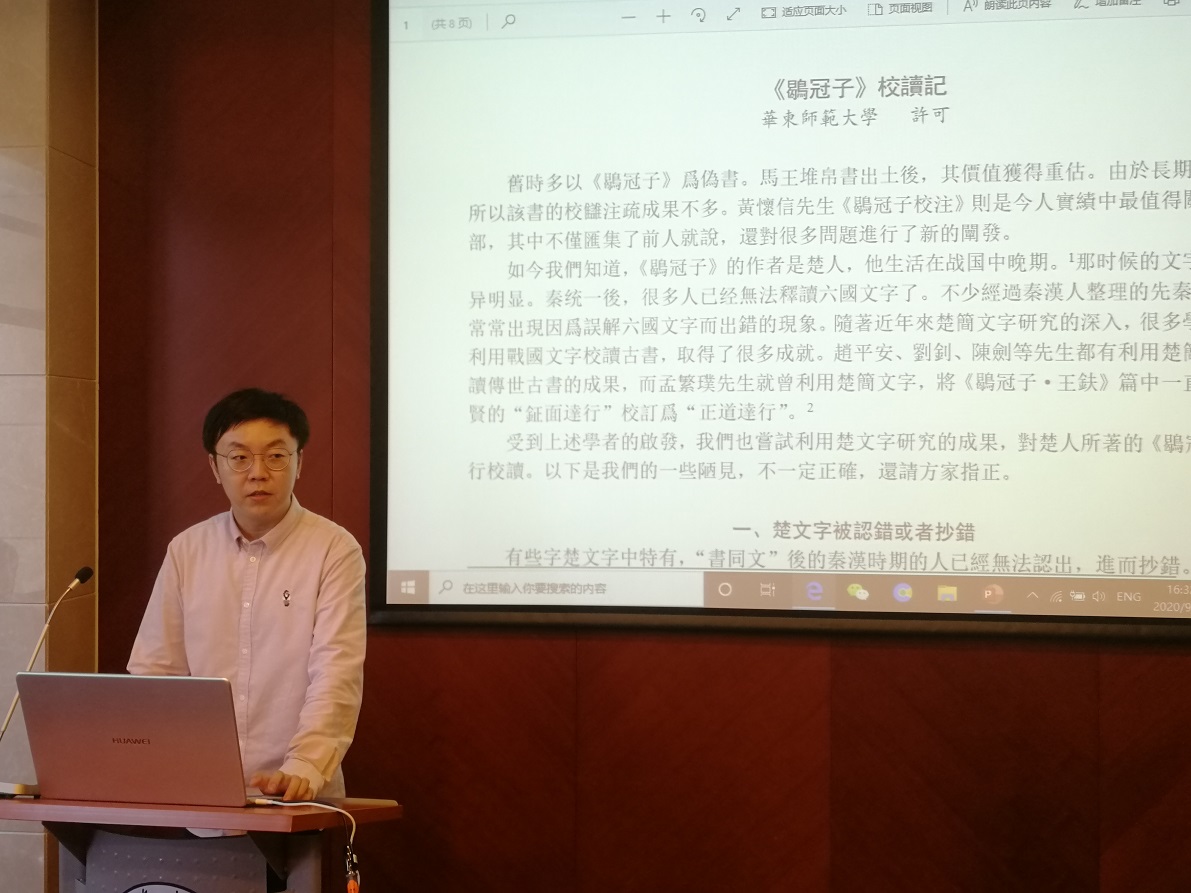 第二位宣读的是华东师范大学中文系许可老师,他在《<鹖冠子>校读记》一文中,他利用楚文字研究的成果,对楚人所著的《鹖冠子》进行校读。认为其书中有楚文字被认错或者抄錯的情况,如【術—道】【𠏄—聽】【順—柔】【絕—繼】【蚤—尤】【軫—斬】【慎—訟】。还可以利用楚文字的用字习惯对一些篇题进行破读:如“著希”当读为“书希”,“隨君”当读为“惰君”等。此外还可以利用其他文献对该书进行进行校读,如“豫四時”当读为“序四時”,“拔陰陽”当读为“支陰陽”、“亶昭穆”当读为“辨昭穆”等。