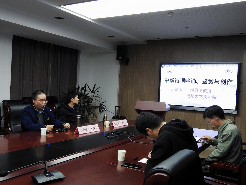 11月19日下午,扬州大学刘勇刚教授应“教育部中华古诗文吟诵和创作基地”之邀,在十大买球的正规网站306会议室作了一场题为“中华诗词吟诵、鉴赏与创作”的讲座。讲座由尹楚兵教授主持,除了在座数十位学生得以现场聆听外,来自不同学校的师生也通过腾讯会议的形式实现线上共享。