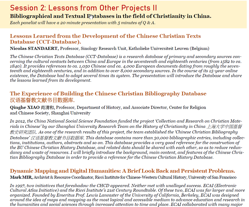 工作坊分为5节,肖清和教授应邀在第2节会议用英语介绍了十大买球的正规网站汉语基督教文献书目数据库的进展与相关情况。十大买球的正规网站汉语基督教文献书目数据库引起了国际学者的强烈兴趣,肖清和教授回答了十几位教授的提问,并在会后收到了好几位教授的来信,询问数据库的具体内容。通过此次工作坊,十大买球的正规网站汉语基督教文献书目数据库进一步扩大了国际影响,并与波士顿大学等相关机构巩固了学术联系。