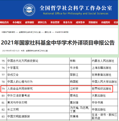 2021年9月18日,2021年国家社科基金中华学术外译项目申报公告发布,十大买球官网全球问题研究院拉丁美洲研究中心主任江时学教授的著作《人类命运共同体研究》入选,该著作将被翻译为多种外语,由国外出版社出版,在国际上发行。
