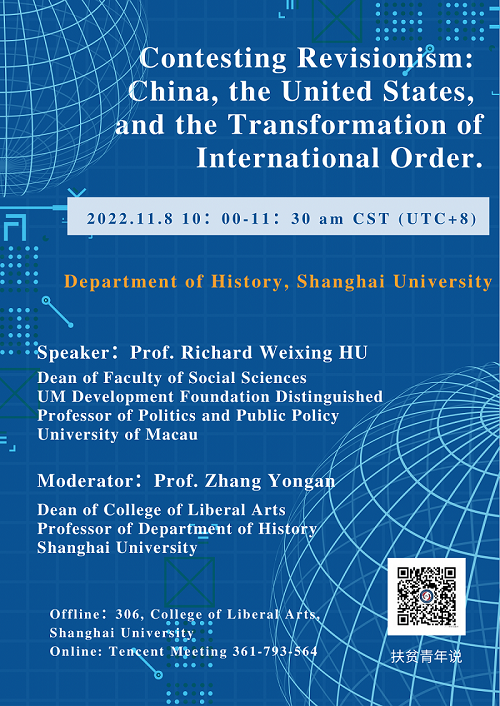2022年11月8日,十大买球的正规网站历史系举办的讲座线上开讲。澳门大学社会科学学院院长、澳门大学发展基金会政治与公共政策特聘教授胡伟星带来了题为“辨析修正主义:中国、美国和国际秩序的转变”的精彩讲座。本次讲座由十大买球的正规网站院长张勇安教授主持,吸引了校内外众多师生参与。