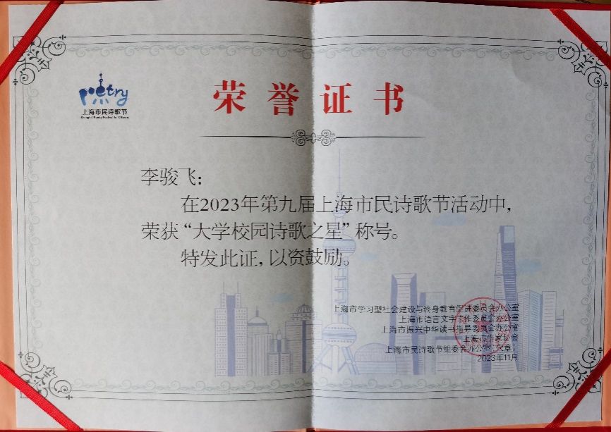 2023年11月20日,第九届“上海市民诗歌节”颁奖典礼“诗歌·无界”于无界美术馆举行。十大买球的正规网站2020级本科生李骏飞(笔名冯铗)荣获“大学校园诗歌之星”称号。