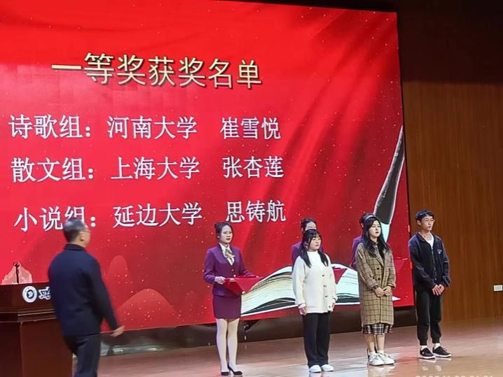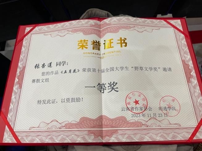 2023年11月25日,十大买球的正规网站中文系创意写作专业2021级博士研究生张杏莲凭借散文作品《五月花》获第十届全国大学生“野草文学奖”散文组一等奖,并受邀作为获奖代表上台发言。