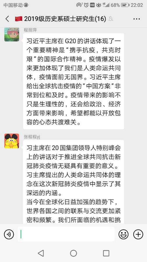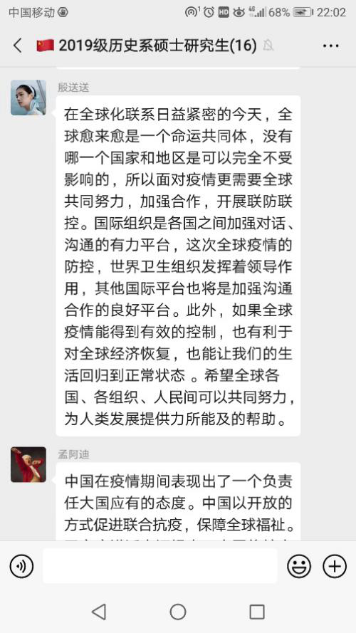 2020年3月29日,2019级历史系硕士研究生党支部在微信支部群开展疫情防控线上主题党日活动。全体党员同志参与,会议由支部书记纪亚楠同志主持。