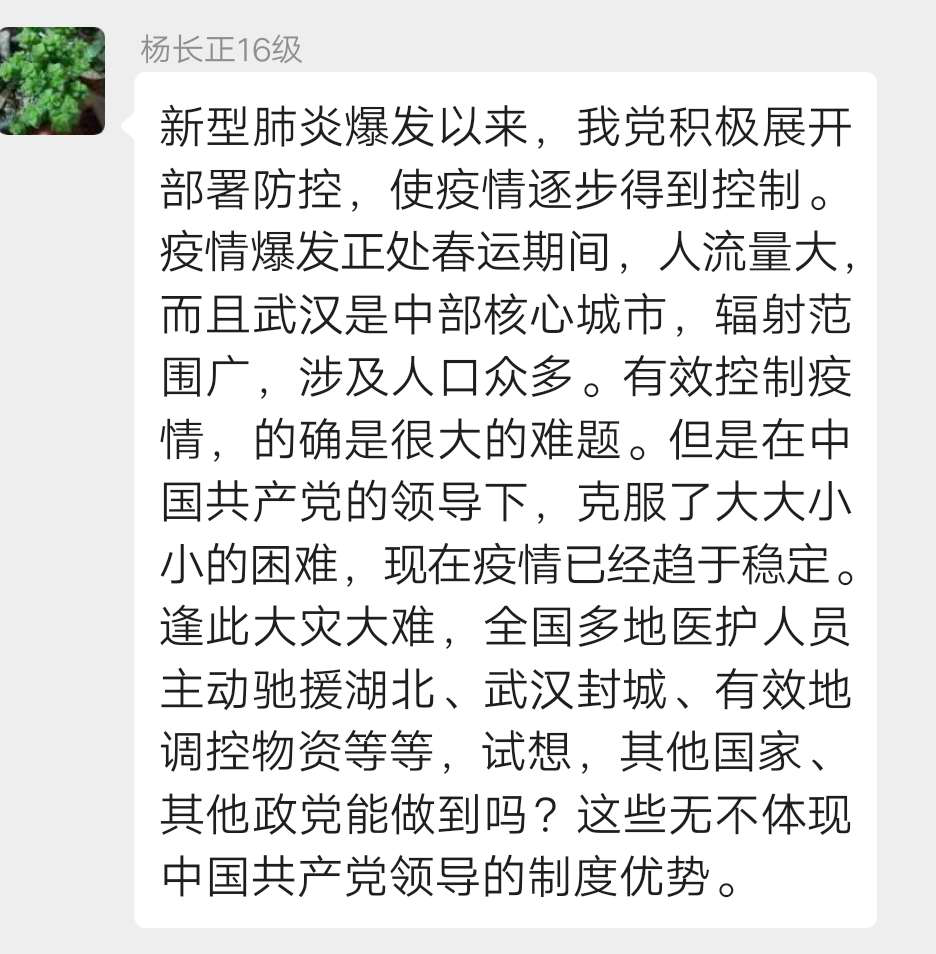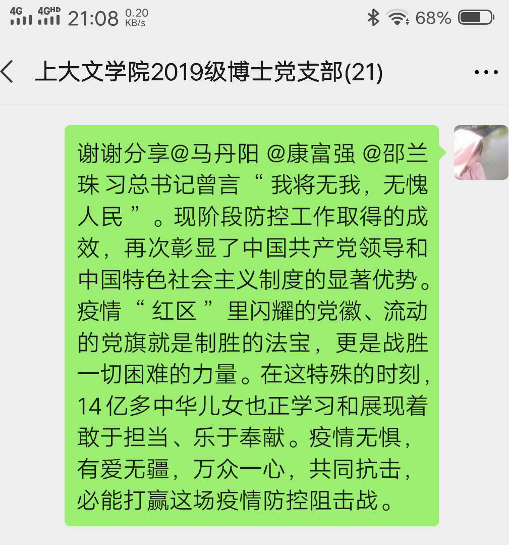 2020年4月7日,2019级博士研究生党支部以“疫情防控彰显中国特色社会主义制度优势”为主题,通过支部微信群开展线上主题党日活动。支部全体党员参加,会议由支部书记梁爽同志主持会议。