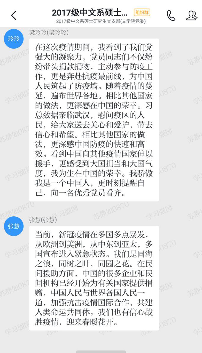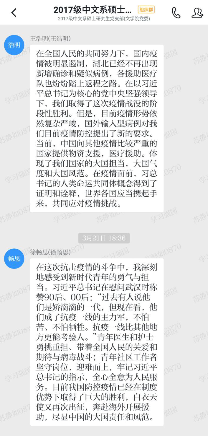2020年3月27日,2017级中文系硕士研究生党支部全体党员在“学习强国”支部群举行主题为“关注疫情动向,加强理论学习”的党日活动,此次会议采用“线下自主学习+线上积极讨论”的形式开展。会议由支部书记苏静如同志主持。