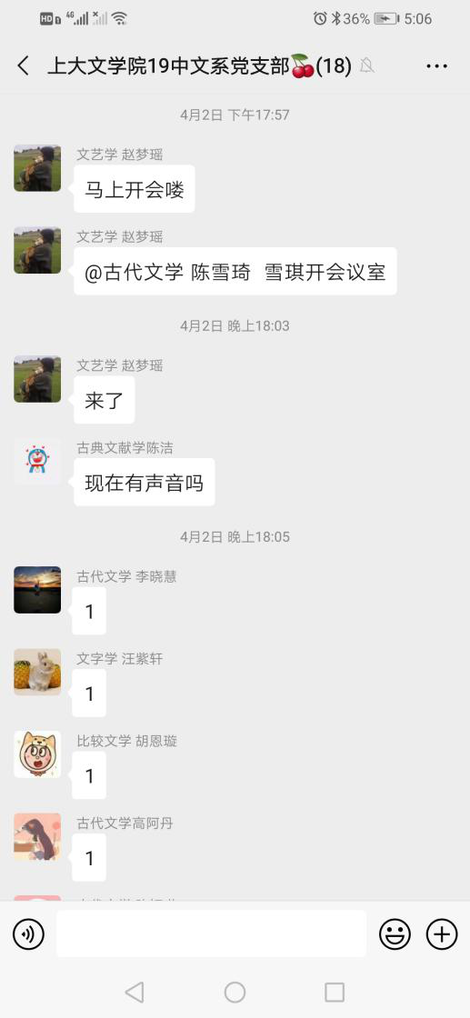 在会议过程中,成员们根据疫情期间的所见所闻、所学所思来进行分享和讨论。有的同志举出每日在学习强国平台、共产党员网上阅读到的抗疫模范的事迹,认为这些模范中有许多人都是基层岗位的普通工作者,比如医护人员、司机、保安等等,但却能够在疫情发生时冲在一线、坚守职责,爆发出不平凡的力量,为这这场疫情阻击战撑起一片天,这是令人动容和值得铭记的。有的同志则提到了自己的父母亲朋,感佩于他们自愿带上袖章,走入社区,积极地投入到群众联防联控的工作中,为构筑起坚实的疫情抗击防线出一份力。也有身在重点疫区的成员实时分享当地目前的抗疫成果、生活状况,说到有一些人感受到疫情好转逐渐放弃戴口罩时,她表示应坚持习近平总书记说的“慎终如始”,不放松不懈怠地将各项防控工作抓紧抓实,才能不辜负前段时间做出的巨大努力,打赢这场疫情防控人民战争、总体战、阻击战。最后,同志们表示,会在坚持做好个人防护、积极参与抗击疫情实践的同时,认真完成线上学习任务,持续关注国党和国家关于抗议工作、经济发展等的重要文件和最新部署,在这场疫情大考中交出合格的答卷。