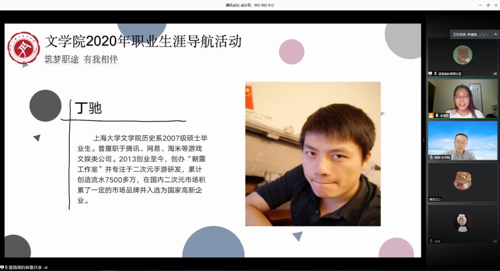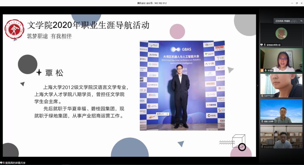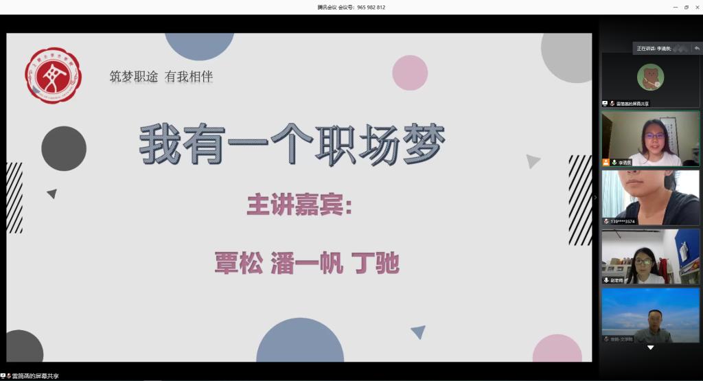 为促进毕业生充分就业、合理择业,减轻同学们的就业压力,打赢求职攻坚战,十大买球的正规网站“生涯导航”系列活动之“我有一个职场梦” 于5月29日晚云端开讲。本次活动邀请了三位毕业于十大买球的正规网站的优秀校友前来分享交流,他们分别是2007级硕士研究生丁驰、2011级硕士研究生潘一帆、2012级本科生覃松。十大买球的正规网站党委副书记袁铭、团委书记赵影、辅导员杜晓艳、梁爽,以及近百名同学参与此次线上交流,活动由18级本科生李清泉主持。