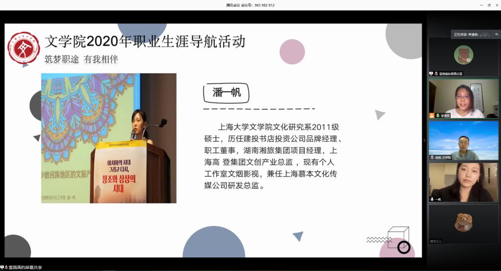 校友潘一帆结合自身经历指出,大学时期应多实践、多积累。学生时期的一些实践经历会对今后的求职、就业产生非常大的影响,鼓励在校大学生们多实践。进入职场后,她强调要能吃苦、肯锻炼、肯学习。在全面深入了解自己所从事的行业的同时,努力找到一个优秀的行业榜样,并向他看齐,不断学习。