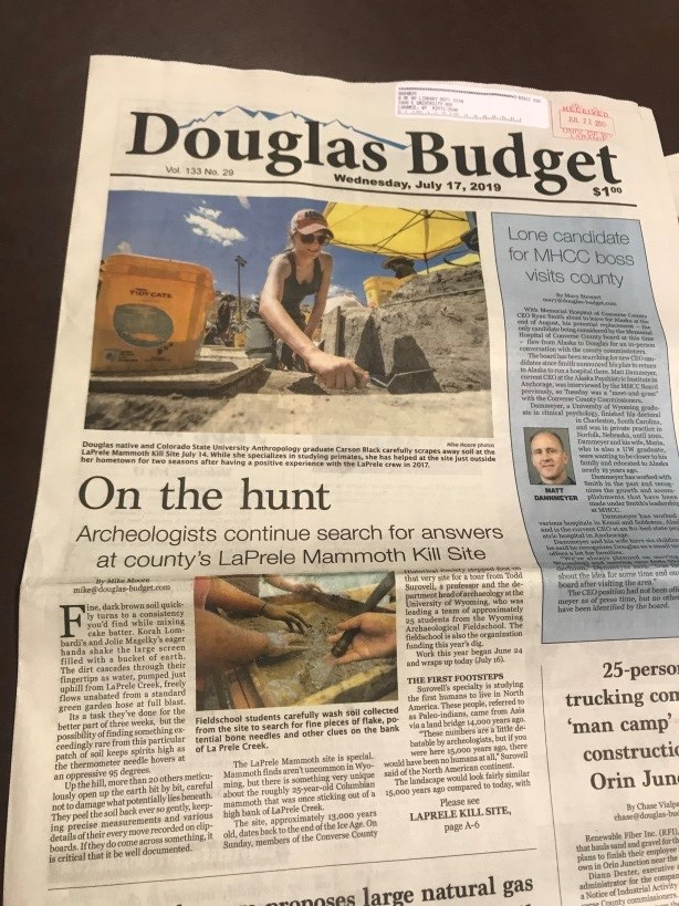 美国人常常外出露营,团队里只有我不会搭帐篷,在此感谢怀俄明大学给我提供的帐篷和睡袋等用具,也感谢大家帮我搭好帐篷。扎营结束后我们来到不远处的遗址,Todd给我们讲了此处遗址的大致情况,有猛犸象的遗迹。午饭后,我们开始进行发掘。每人被分到一个一平米左右的探方。我们的遗址还被当地媒体进行报道,并在报纸头版发了近两版报道。Todd也接受了采访。