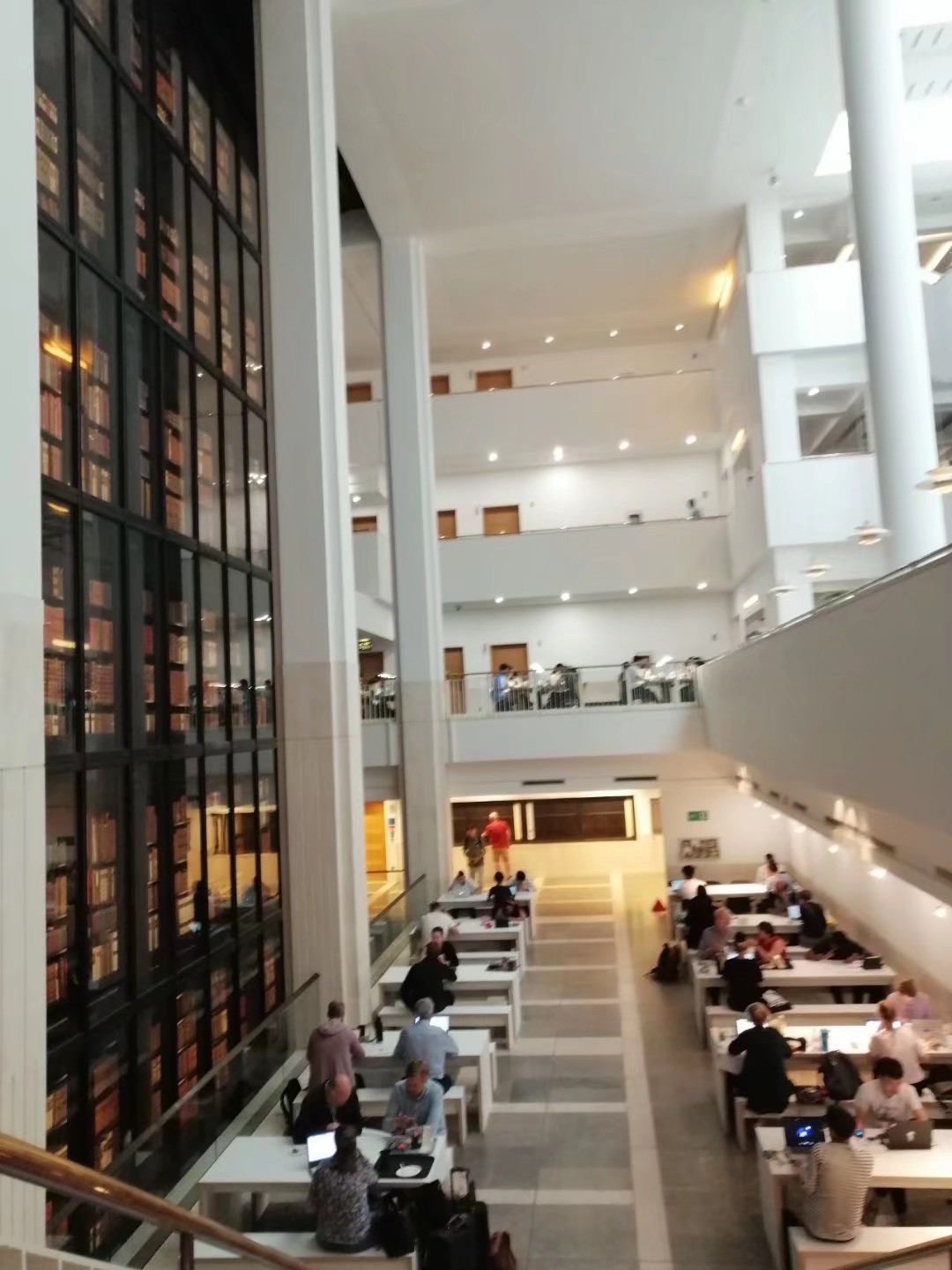 大英图书馆作为世界上最大的学术图书馆之一,的确是一个巨大的知识库和学习研究的好去处,不仅拥有超过一亿五千万件馆藏,包括期刊、报纸、剧本、专利、图画等,既有最近出版的,也有古老至公元前二千年的古籍手抄本。它是一座创造性、资源性、高效率的图书馆,它立足于英国,服务于全世界,这正和它的使命:“通过其学术、研究及创新提供对馆藏及信息的存取,培养、鼓励、促进对知识的追求”有关。而且有了准入卡,还可以在网上提前约资料送到要去的阅读室,一般7个小时或者24小时就可以到,直接过去请工作人员帮忙取出来就好了。在这里,我体会到了对知识最大的尊重和敬仰,所有人都会为你学习研究提供尽可能完善的帮助。你可以用手机拍照记录,也可以选择去复印你需要的资料。如果资料看了想继续看,直接请他们帮你保留预订就行。作为世界学术资源的重要代表,图书馆每年接待大量的国内、外学术来访者和读者。它最大限度地向用户开放阅览室,提供及时、迅捷和方便的服务。在进入图书馆时是需要安检的。入口处有最近的展览和文化活动介绍,这也是它的一个特色吧,既是一个馆藏丰富的图书馆,又像一个有自我特色的博物馆。