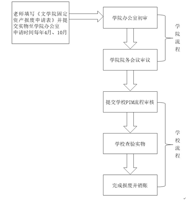 为了进一步规范学院固定资产报废管理,提高使用效益,更好地为教学、科研服务。依据学校相关规定,结合学院实际情况,特制订本流程。